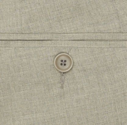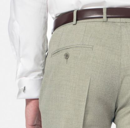 Tył spodni wykończony klasycznymi, wpuszczonymi kieszeniami z guzikiem.