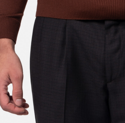 Komplet wykonany z wysokiej jakości tkaniny jest idealną propozycją na nadchodzący sezon. Tkanina w kolorze grafitu, zdobiona delikatą kratą w odcieniach brązu, świetnie sprawdzi się jako stylizacja biznesowa w połączeniu z klasyczną białą koszulą i krawatem. Dwurzędowa kamizelka do kompletu dodatkowo podkreśli elegancki charakter stroju. Modowego twista dodadzą kompletowi spodnie z mankietami i stylowe derby na grubej podeszwie. Cała stylizacja nabierze świeżości i będzie wyglądać bardzo interesująca. Ci, którzy wolą mniej oficjalne połączenia mogą łączyć komplet z cieńszym modelem golfu lub swetra.