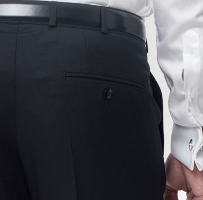 Tył spodni wykończony klasycznymi, wpuszczonymi kieszeniami z guzikiem.