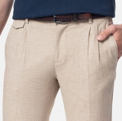 Spodnie z zakładkami to uniwersalny model, który sprawdzi się w szafie każdego mężczyzny, który ceni sobie komfort, elegancję i ponadczasowy styl. Ich uniwersalność pozwala na tworzenie różnorodnych stylizacji od casualowych po bardziej eleganckie. Zestawione z białą lnianą koszulą i skórzanymi mokasynami stworzą klasyczny, letni look. Połączenie spodni z t-shirtem i rozpinanym kardiganem lub marynarką to swobodna, ale i bardziej elegancka stylizacja idealna na spotkanie ze znajomymi.