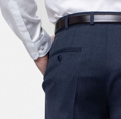 Eleganckie spodnie o wyrazistej, drobno prążkowanej strukturze, która dodaje tkaninie głębi i podkreśla jej szlachetny charakter. Dzięki dodatkowi wełny model prezentuje się niezwykle estetycznie, a jednocześnie zapewnia komfort noszenia przez cały dzień. W zestawieniu ze marynarką do kompletu, koszulą i krawatem spodnie tworzą stylizację idealną na formalne spotkania, uroczystości czy ważne wydarzenia biznesowe. W bardziej swobodnej odsłonie świetnie prezentuje się z gładkim golfem oraz sztybletami, nadając stylizacji lekkości i nowoczesnego charakteru. Stonowany odcień granatu sprawia, że model z łatwością komponuje się zarówno z klasycznymi kolorami, jak i z cieplejszymi, jesiennymi tonami.