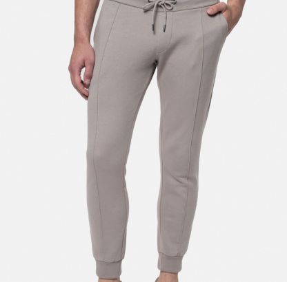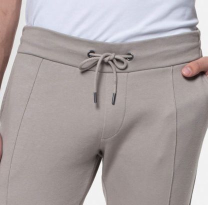 Spodnie typu joggers z elastycznym pasem wiązanym na troczki, nogawki o swobodnym fasonie. Spodnie typu ‘elegancki dres’. Wykonane z gładkiej dzianiny z wysoką zawartością bawełny. Na nogawkach mają przeszyty kant, na przodzie i tyle posiadają kieszenie. Wszywka kolekcyjna na tyle spodni.