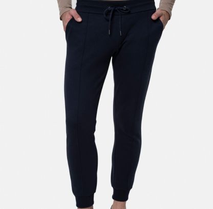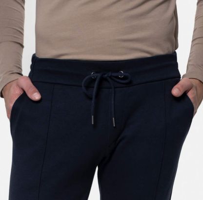 Spodnie typu joggers z elastycznym pasem wiązanym na troczki, nogawki o swobodnym fasonie. Spodnie typu ‘elegancki dres’. Wykonane z gładkiej dzianiny z wysoką zawartością bawełny. Na nogawkach mają przeszyty kant, na przodzie i tyle posiadają kieszenie. Wszywka kolekcyjna na tyle spodni.