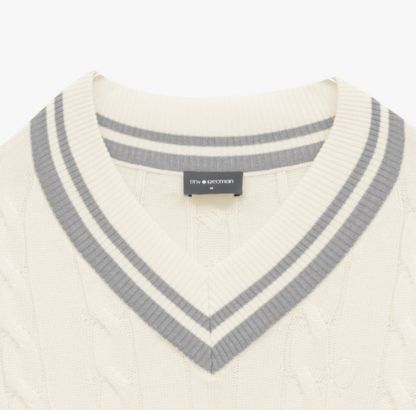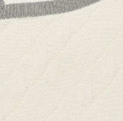 Sweter z dekoltem V oraz warkoczami, wzornictwem nawiązuje do tradycji mody tenisowej. Został wykonany z dzianiny z domieszką bawełny, która jest bardzo przyjemna w dotyku. Dekolt swetra został ozdobiony kontrastowymi paskami, które nadają mu sportowego charakteru. Na piersi wyhaftowane logo tenisowe.