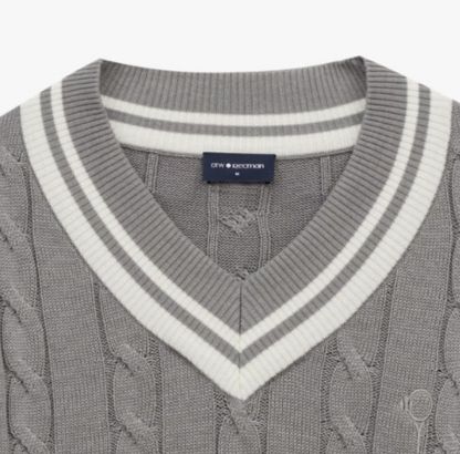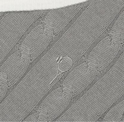 Sweter z dekoltem V oraz warkoczami, wzornictwem nawiązuje do tradycji mody tenisowej. Został wykonany z dzianiny z domieszką bawełny, która jest bardzo przyjemna w dotyku. Dekolt swetra został ozdobiony kontrastowymi paskami, które nadają mu sportowego charakteru. Na piersi wyhaftowane logo tenisowe.